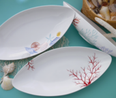 楕円のとても使いやすい白いお皿に、夏をイメージするサンゴや貝の絵を筆で描いていきます。