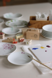 イベント中の『プチ絵付け体験』は、筆で絵やラインを描いたり、アルファベットスタンプでイニシャルを付けたり、スポンジに絵の具をつけてポンポンとたたいて色を塗ったりします。自由に、お好きなものを描いてください。もちろん、ご参考にしていただく作品もご用意してあります。出来上がった作品は、アトリエにある窯で焼き付けます。